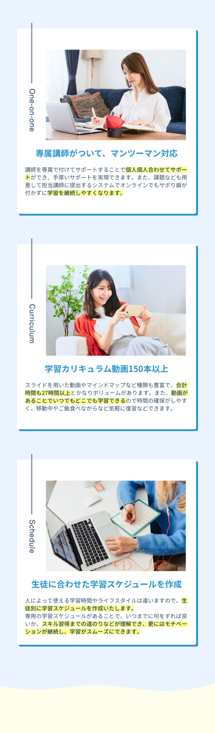 WEB free lance school よくあるご質問 Q パソコンが得意でない未経験ですが大丈夫ですか? A 約9割が未経験からのスタートですので問題ございません。 Q 仕事と並行しながらでもできますか? A その人に合ったスケジュールで学習していきますので、仕事と学習の両立は可能です。 Q スマホからでも参加できますか? A はい、個別の無料レクチャーはZoomで行いますのでスマホからでも参加可能です Q 申し込み後、無料レクチャーのキャンセルは可能でしょうか? A 無料枠を確保して個別で行う為、当日のキャンセルはご遠慮下さい。どうしても都合が合わない場合は分かり次第ご連絡をお願いいたします。 特定商取引に基づく表記 プライバシーポリシー Copyright Ⓒ 2026 All Rights Reserved.